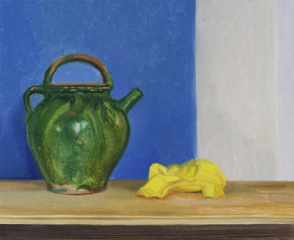 Still life with green jug and dishcloth, oil on linen, 22.6 x 27.8 cm, 2019