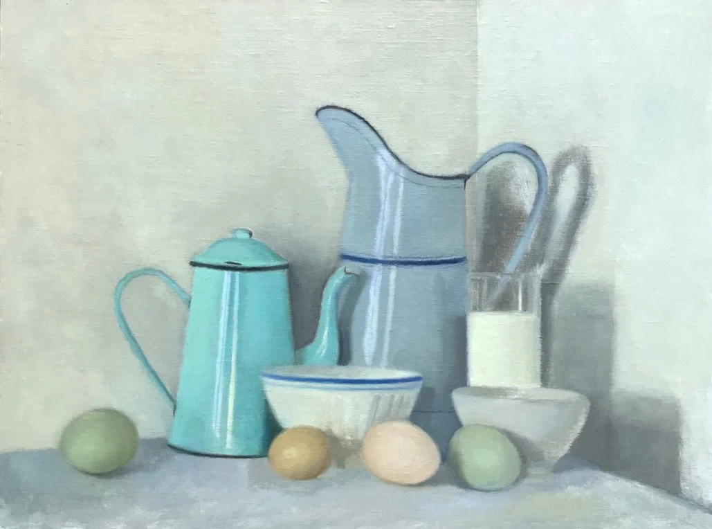 Blue, white and silver still life, oil on linen, 31 x 44cm, 2019, private collection