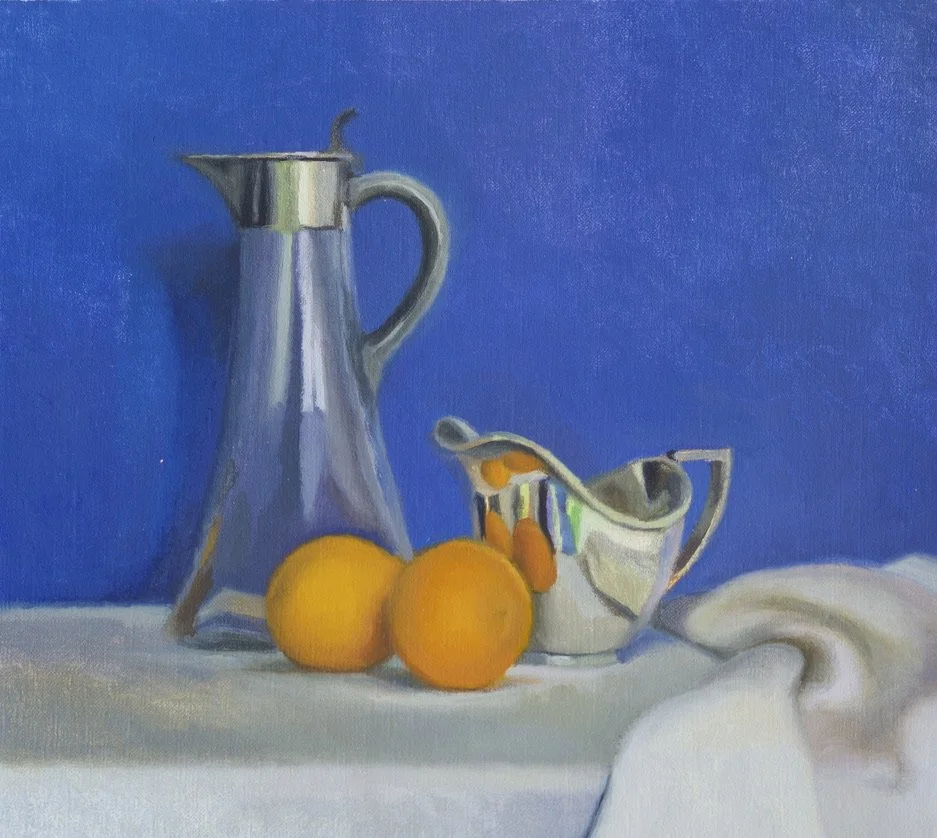 Still life with claret jug and oranges, oil on linen, 21 x 23 cm, 2019