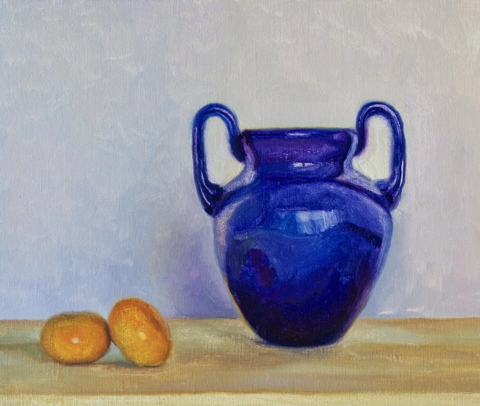 Still life with blue vase and mandarins, oil on linen, 19.5 x 23 cm, 2019