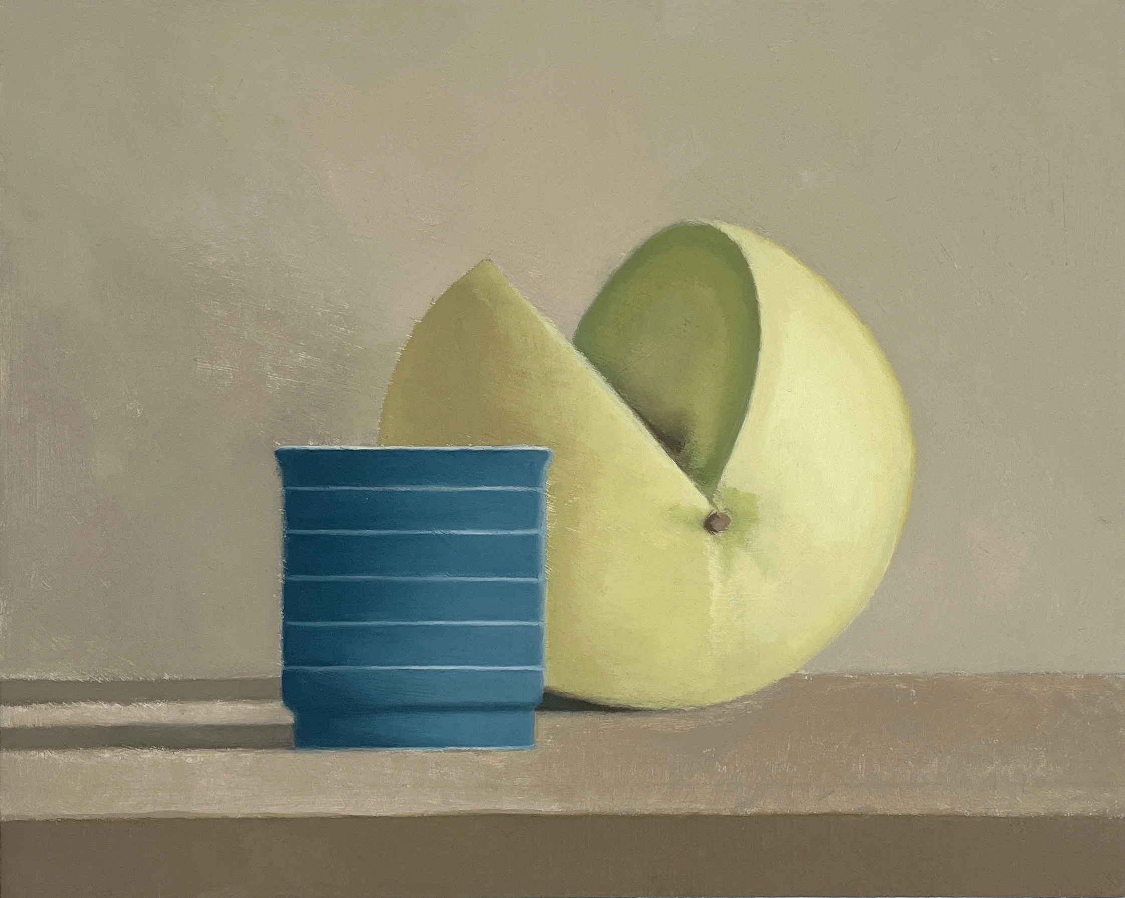 Honeydew melon and blue cup, oil on linen on board, 20.3 x 25.3 cm, 2023, private collection