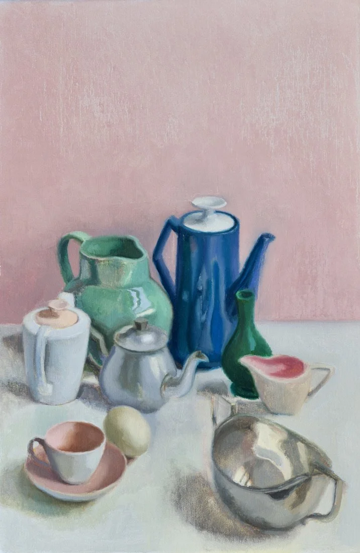 Pink, green and silver still life, oil on linen, 37.5 x 25cm, 2020, private collection