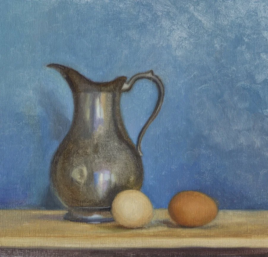 Still life with pewter jug and eggs, oil on linen, 19.7 x 20.5cm, 2019