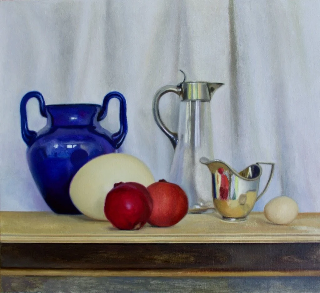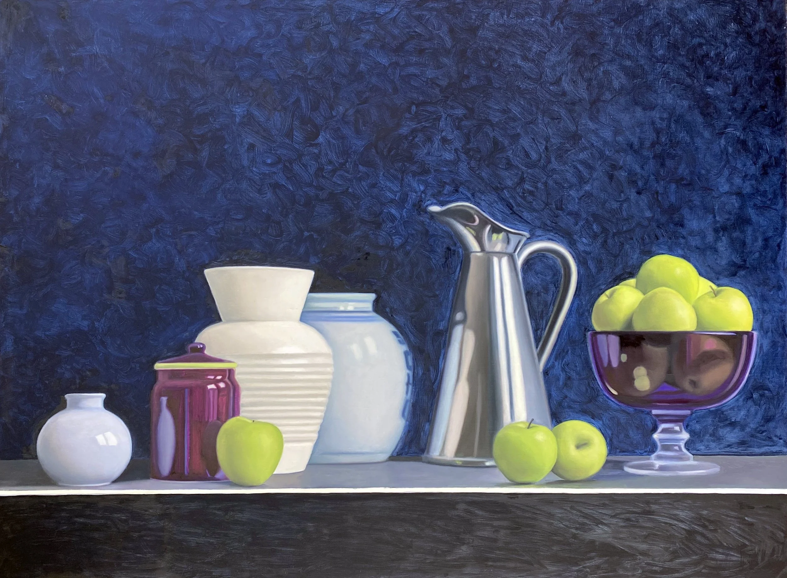 Navy, silver, green apple still life, oil on linen, 76 x 101.4 cm, 2021, private collection