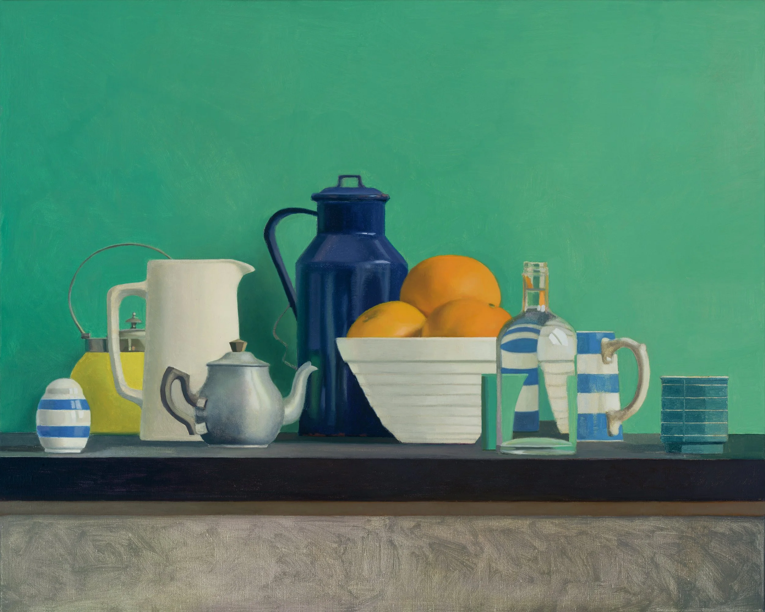 Green, blue, grapefruit still life, oil on linen, 60.5 x 76 cm, 2021, private collection