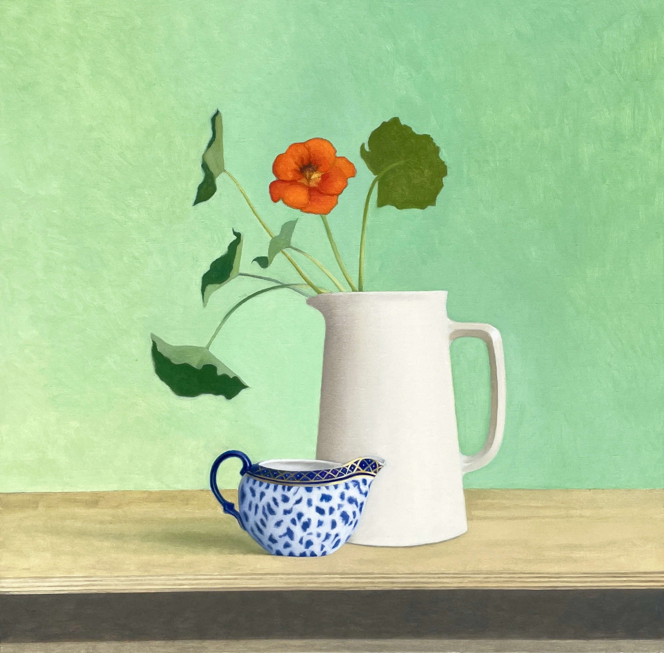Mint and nasturtium still life, oil on linen, 62 x 63 cm, 2023, private collection